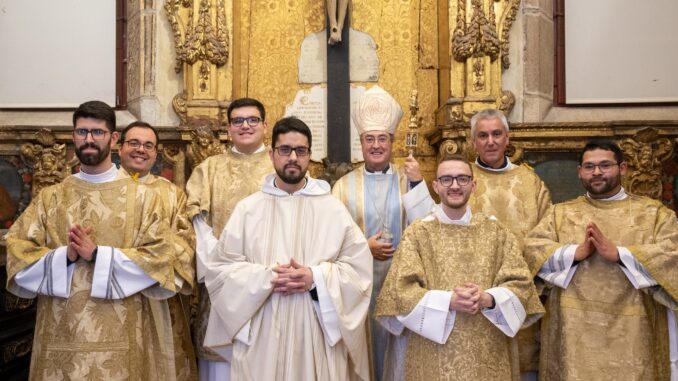 Decorreu a 16 de novembro, domingo, na Casa Diocesana de Vilar, o retiro dos candidatos em formação para o diaconado, orientado pelo Diác. António Abreu. O retiro, que gravitou em torno do tema «diáconos profetas e semeadores de esperança», serviu também de preparação para as instituições nos ministérios de Leitor e de Acólito, no percurso para o diaconado, que vão ocorrer a 30 de novembro, na Sé do Porto. D. Joaquim Dionísio, bispo auxiliar do Porto, presidiu à eucaristia de encerramento, na qual foram admitidos entre os candidatos à ordem do diaconado os seguintes formandos: António Jorge Ribeiro, da Paróquia de Guifões, Matosinhos; Fernando Dias, da Paróquia da Campanha, Porto; Francisco Barbosa, da Paróquia da Senhora da Hora, Matosinhos; José Miguel Tavares, da Paróquia de São Paio de Oleiros, Santa Maria da Feira; Manuel Fortunato, da Paróquia de Gueifães, Maia. Na mesma celebração, o bispo acolheu o juramento e a profissão de fé do candidato António Armindo Sousa, da Paróquia de Nevogilde, Porto, cuja ordenação diaconal está prevista para 8 de dezembro na Sé do Porto. Na sua homilia, D. Joaquim Dionísio colocou em relação o chamamento e o envio, referidos à vocação diaconal. No final deixou uma palavra de agradecimento às esposas dos candidatos em formação. A Diocese do Porto tem no presente ano pastoral 15 candidatos no triénio de formação para o diaconado, a que se junta o que vai ser ordenado em dezembro, bem como cinco aspirantes em tempo propedêutico, que iniciaram o seu percurso a 8 de novembro e não participaram neste retiro.8 de novembro de 2025